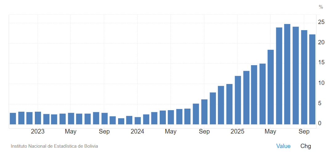 Bolivia’s fiat currency, the boliviano, has seen skyrocketing inflation over the last year. Although it has fallen since hitting a high this summer, it remains above 20% as of October 2025.