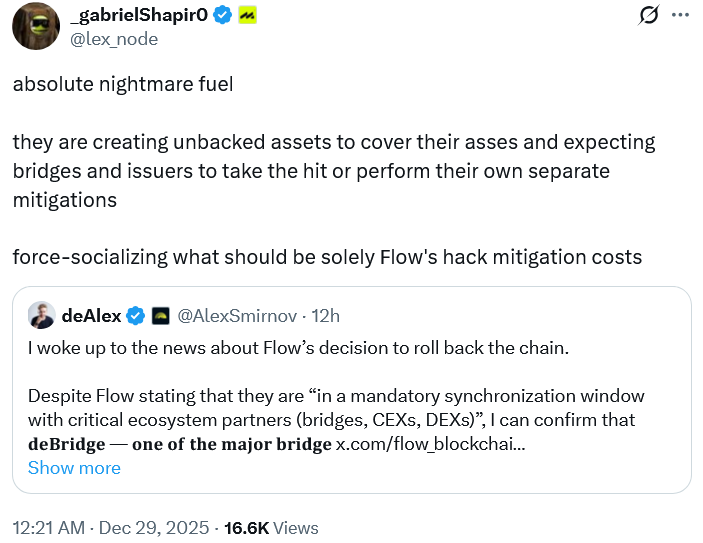 General counsel at crypto investment firm Delphi Labs Gabriel Shapiro also slammed Flow’s resolution approach, stating: “They are creating unbacked assets to cover their asses and expecting bridges and issuers to take the hit or perform their own separate mitigations.”