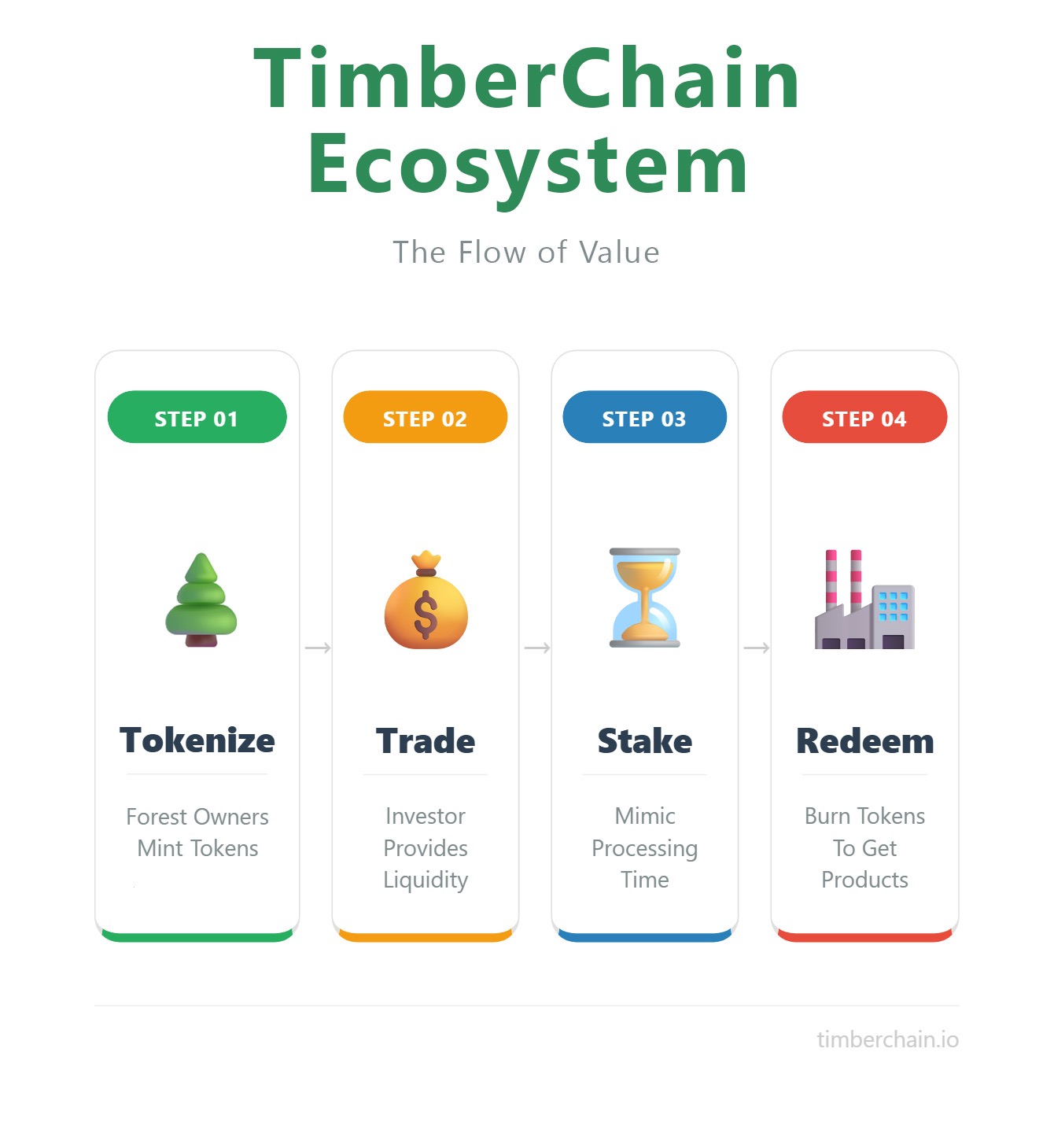 The incentives are also tied to physical reality. During its journey from raw log to dried timber, the value of wood increases around 3-4 times. Staking on TimberChain reflects this appreciation; locking for the full period staking incentives that follow this increase in value.