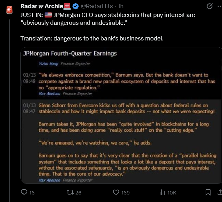 Responding to the question, JPMorgan chief financial officer Jeremy Barnum said the bank’s position aligns with the intent of the GENIUS Act, which seeks to establish guardrails around stablecoin issuance.