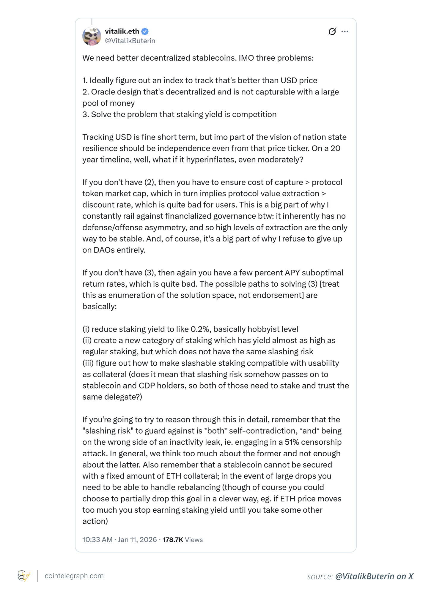 That dependence is why Vitalik Buterin’s latest warning is of particular interest. In a January 11, 2026, post, he argued that crypto still needs better decentralized stablecoins, highlighting three unresolved issues: the need for a benchmark beyond the USD price, oracles that cannot be captured by deep pockets and staking yields that compete with stablecoin designs.
