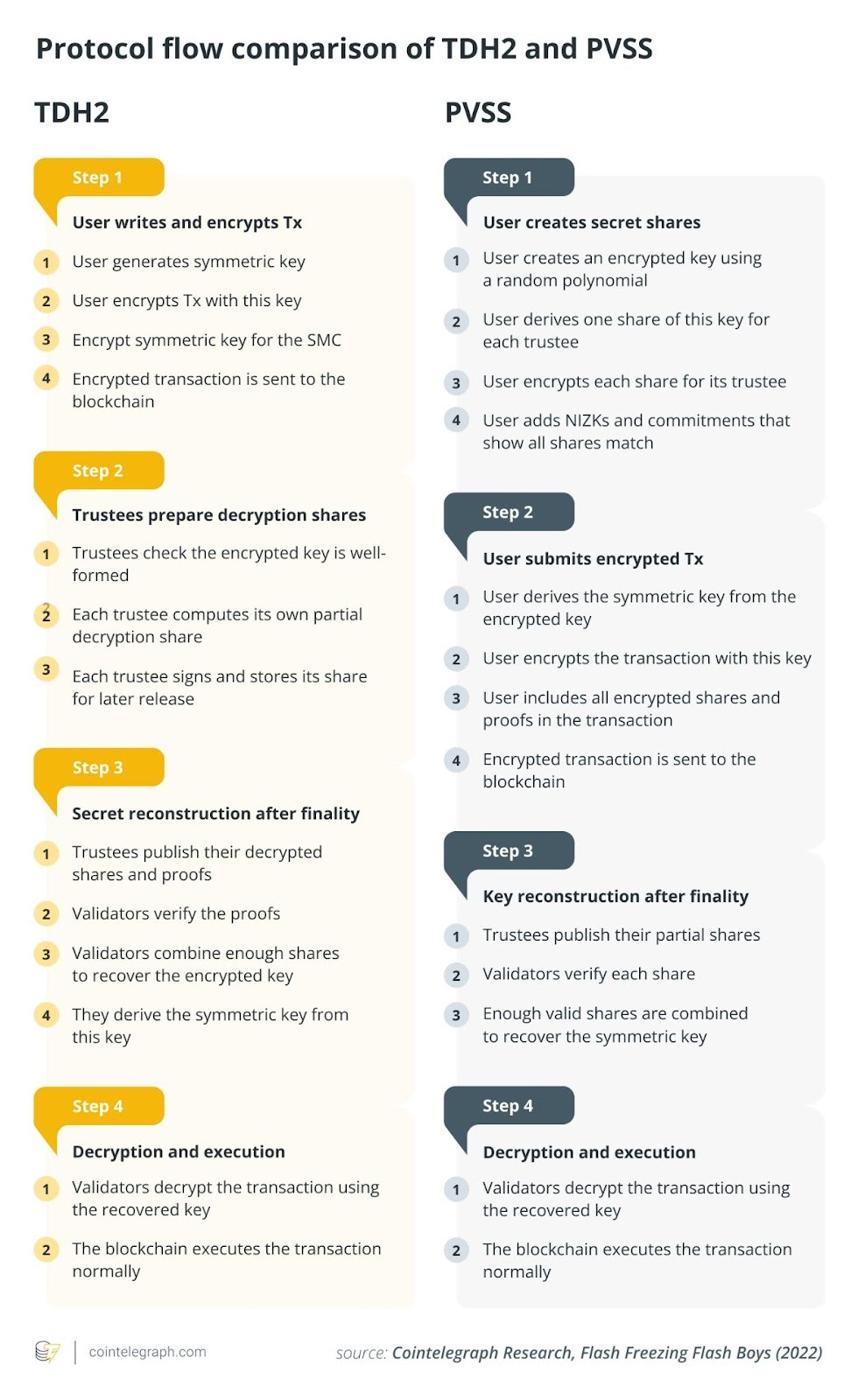 The second scheme, PVSS (Publicly Verifiable Secret Sharing), follows a different path. Instead of the committee running a DKG in every epoch, committee members each have a long-term private key and a corresponding public key, which is stored on the blockchain and accessible to any user. For each transaction, users pick a random polynomial and use Shamir’s secret sharing to generate secret shares, which are then encrypted for each chosen trustee using the respective public key. The symmetric key is obtained by hashing the reconstructed secret. The encrypted shares are each accompanied by an NIZK proof, which allows anyone to verify that all shares were derived from the same secret, along with a public polynomial commitment, a record that binds the share-secret relationship. The subsequent steps of transaction inclusion, post-finality share release, key reconstruction, decryption and execution are similar to those in the TDH2 scheme.