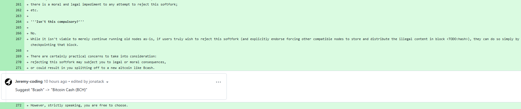 Then starting on line 270 and continuing to line 272, the developers go into further detail, “rejecting this soft fork may subject you to legal or moral consequences, or could result in you splitting off to a new altcoin like Bcash. However, strictly speaking, you are free to choose.”