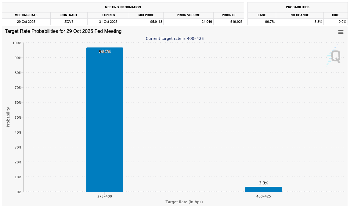 That said, markets are confident that the Federal Open Market Committee (FOMC) will opt for a 0.25% cut — data from CME Group’s FedWatch Tool puts the odds at over 95%.