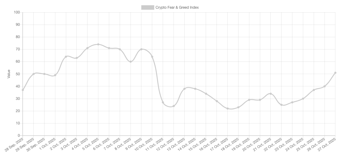 Data from the Crypto Fear & Greed Index currently indicates that the crypto market sentiment is in “neutral” territory.