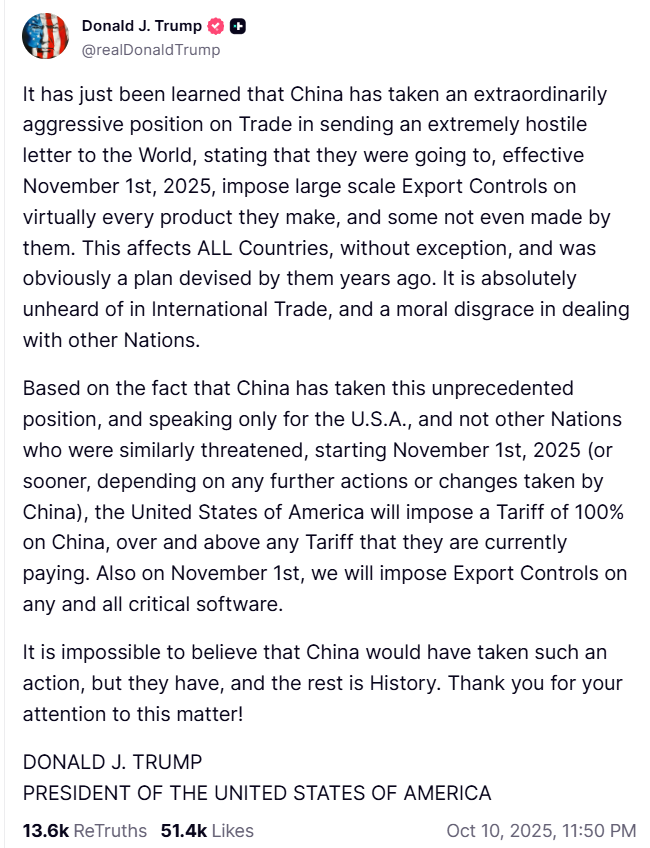 “[…] starting November 1st, 2025 (or sooner, depending on any further actions or changes taken by China), the United States of America will impose a Tariff of 100% on China, over and above any Tariff that they are currently paying,” wrote Trump in an Oct. 10 Truth Social post.