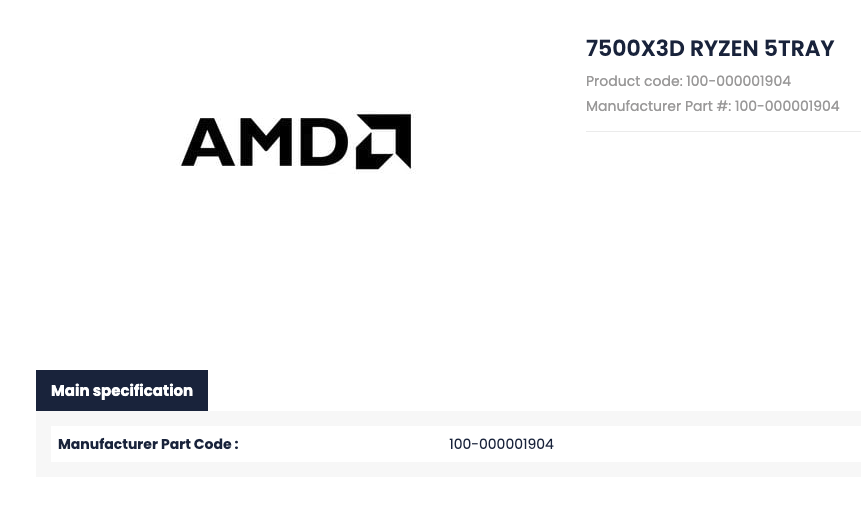 The CPU page shows a Manufacturer Part Code: 100-000001904, ditto a product code, titled as 7500X3D Ryzen 5 Tray which appears to be the smaller sibling of the Ryzen 5 7600X3D launched in 2024.