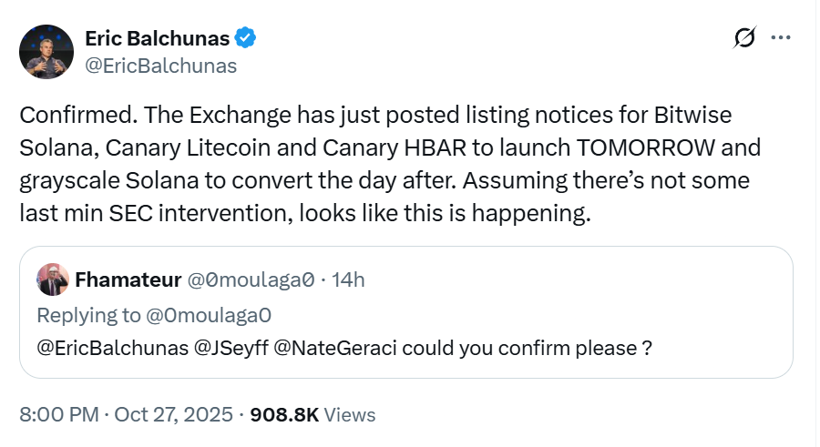 At least three altcoin ETFs are expected to launch later on Tuesday: Bitwise’s Solana (SOL) ETF and Canary’s Litecoin (LTC) and Hedera (HBAR) ETFs, according to Bloomberg analyst Eric Balchunas.