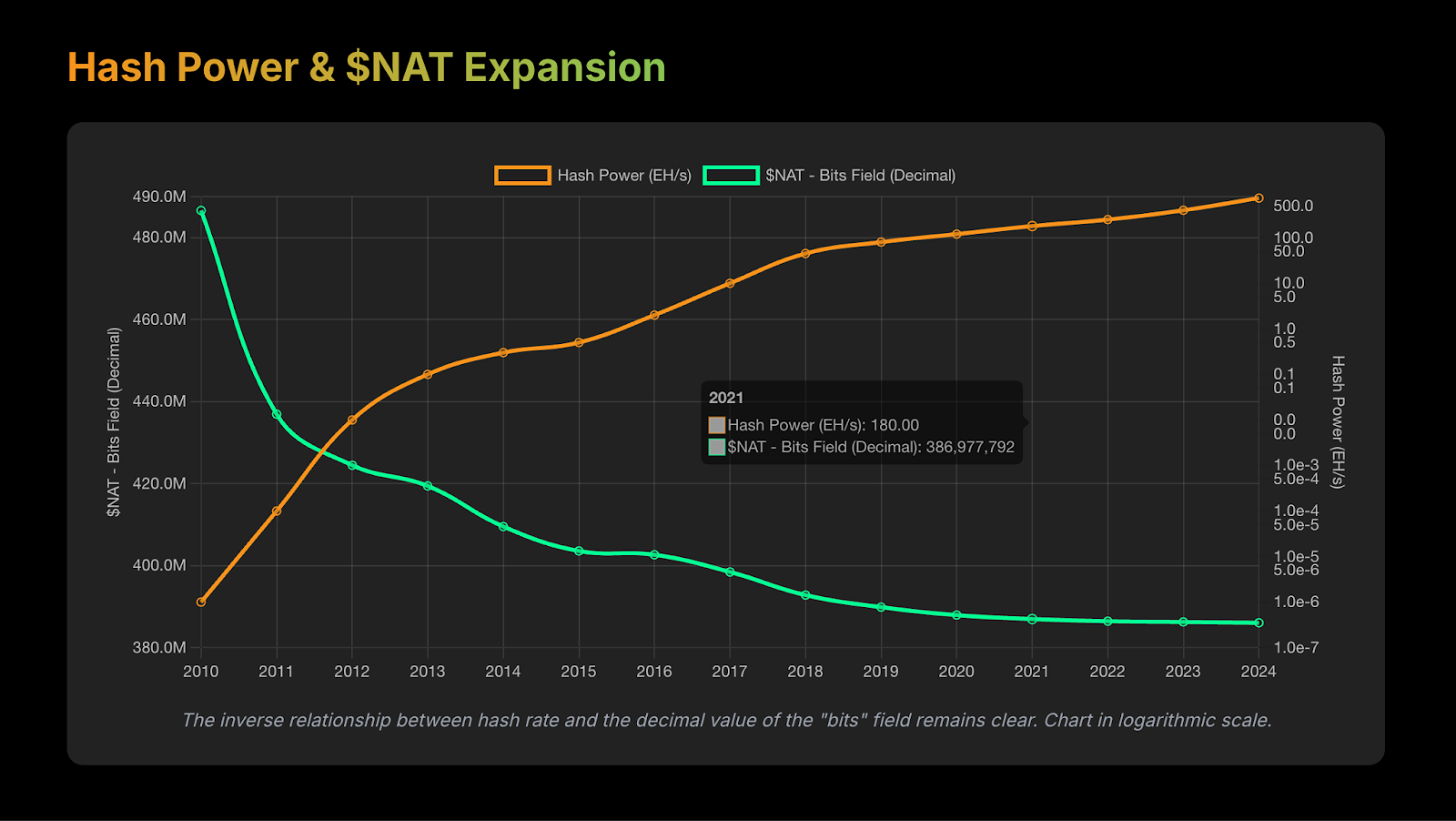 The most striking TAP-enabled use case for post-halving incentives is NAT, a token aligned with Digital Matter Theory (DMT) that uses Bitcoin’s own block data to determine issuance. Starting at block 885,588 on Feb. 27, 2025, every winning Bitcoin block began to trigger a NAT distribution into the miner’s wallet in addition to the BTC they earned. The amount adjusts with network conditions because it derives from Bitcoin data at the moment of confirmation, based on block difficulty.