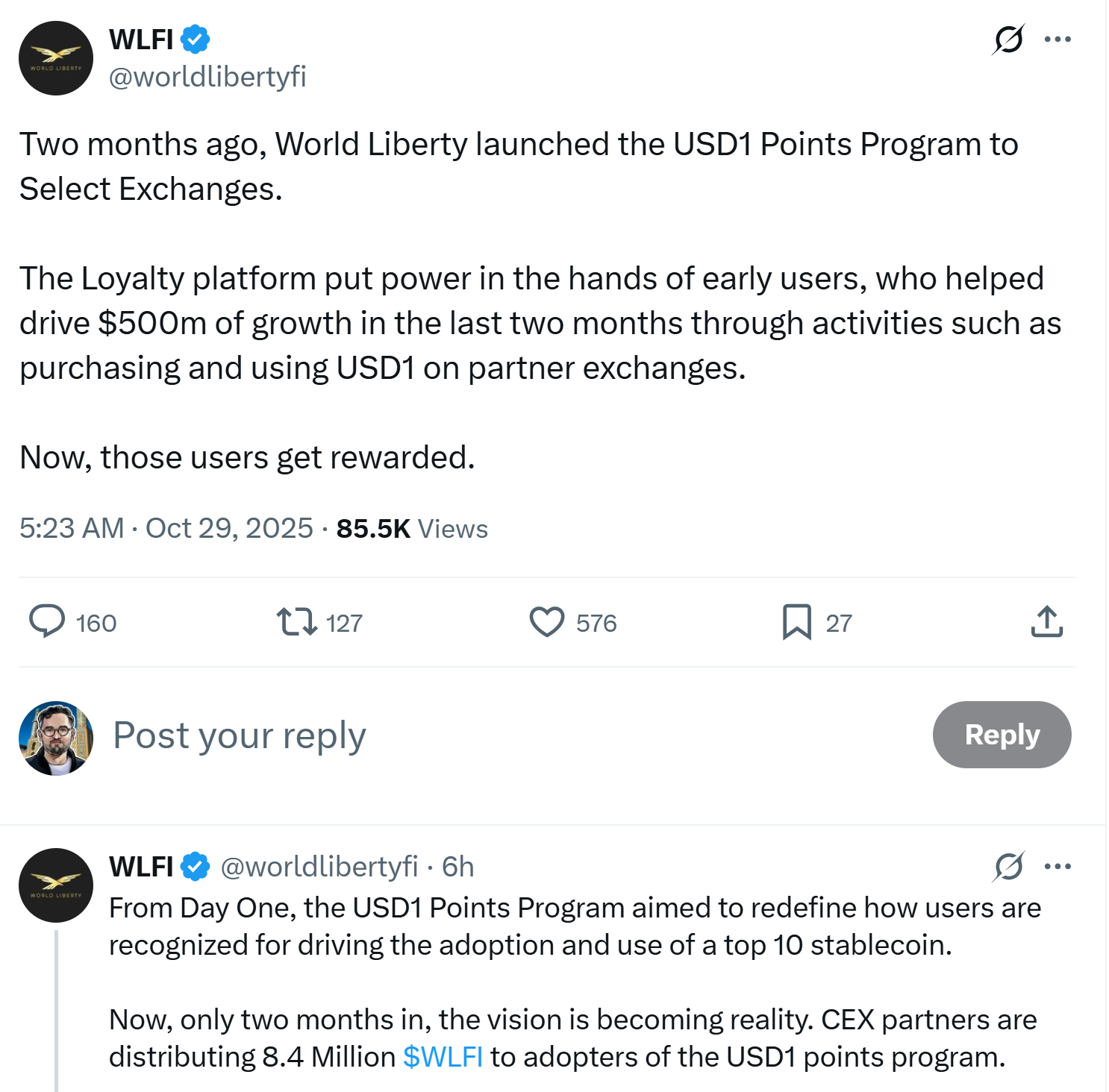 World Liberty said the points initiative will expand to include new venues, decentralized finance integrations, and more ways for users to earn and redeem rewards. “This is only the beginning,” the company wrote.