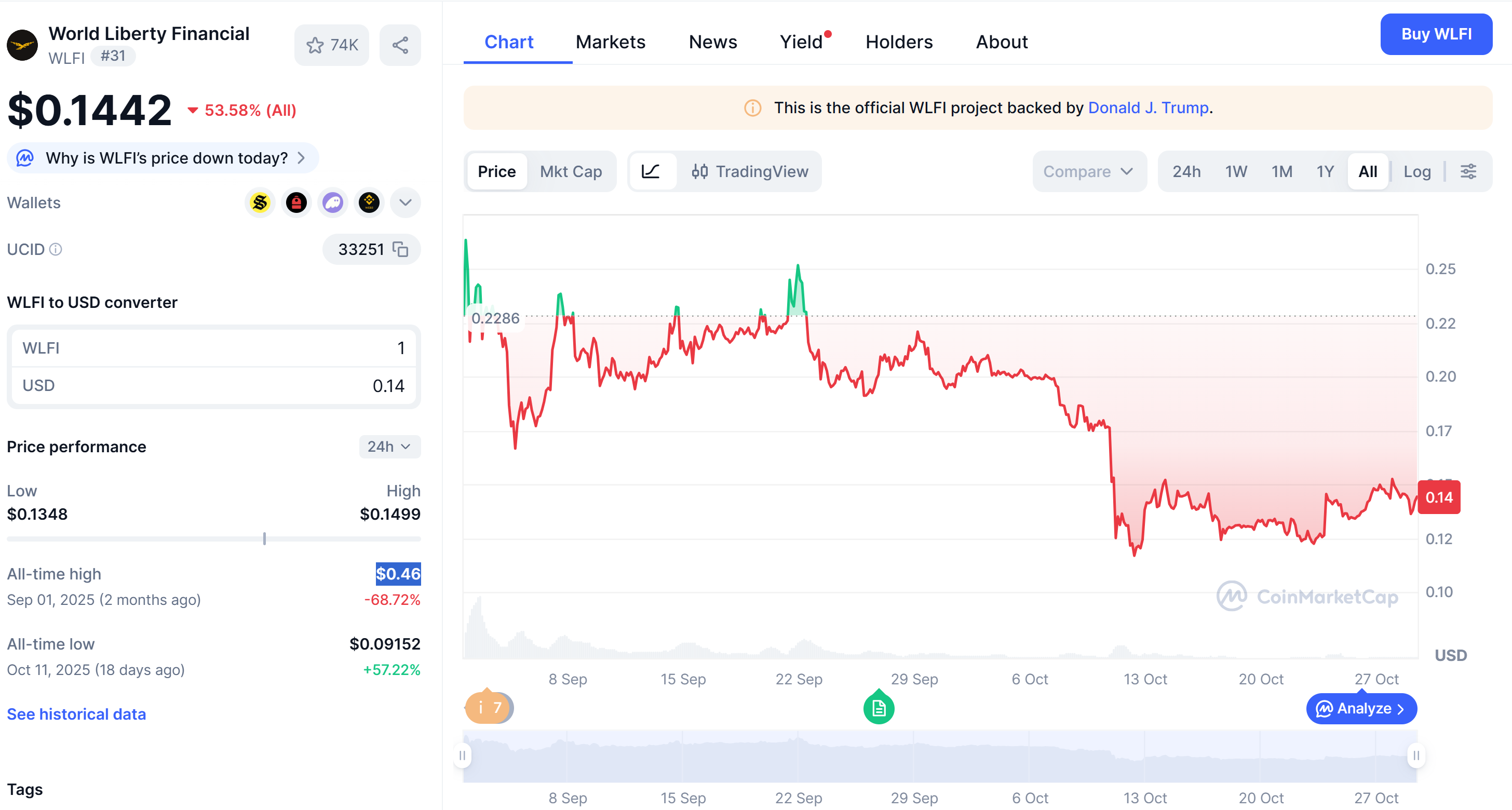 WLFI is currently trading at $0.14, down 0.5% over the past 24 hours, data from CoinMarketCap shows. The token is down nearly 70% from its all-time high of $0.46 registered in September.