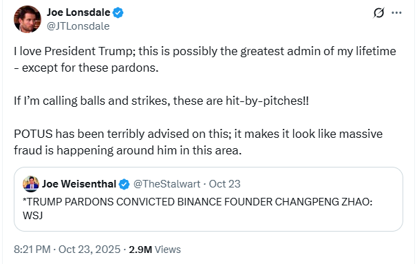 It is even more problematic in the instance of Zhao’s pardon. Binance, the majority of which Zhao still reportedly owns, was reportedly a significant investor in Trump’s crypto project, World Liberty Financial. According to the New Yorker, the exchange lobbied Trump-associated lawyers to secure a pardon. Palantir co-founder Joe Lonsdale said:
