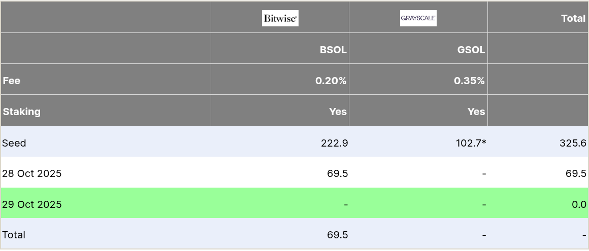According to data from Farside Investors, the US Solana ETF market currently includes only two products, those from Bitwise and Grayscale. Together, they introduced $325.6 million in seed capital, while Bitwise added $69.5 million in inflows on its first day of trading.