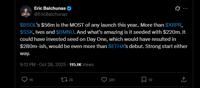 Bloomberg senior ETF analyst Eric Balchunas reported that Bitwise’s SOL staking ETF had the largest trading volume of any ETF on debut in 2025.