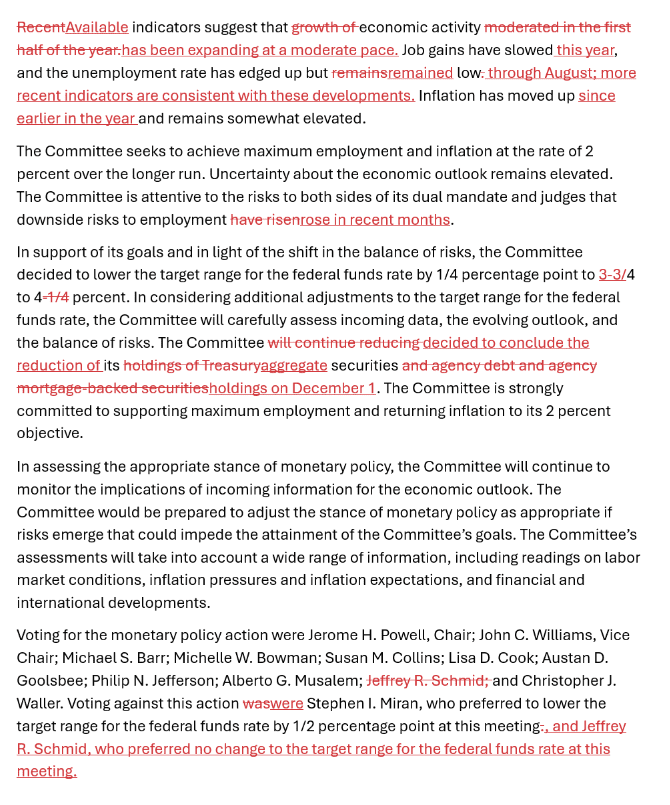A notable addition to the FOMC statement was confirmation that the Fed will cease shrinking its balance sheet on Dec. 1, marking an end to quantitative tightening.