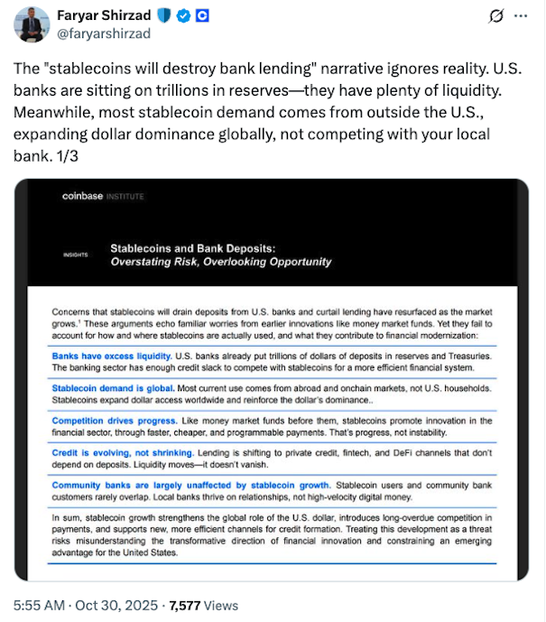 “The ‘stablecoins will destroy bank lending’ narrative ignores reality,” Coinbase policy chief Faryar Shirzad said on Wednesday.