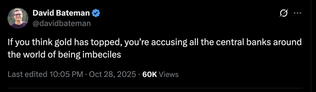 Gold is still up around 50% year-to-date, buoyed by record central-bank purchases, persistent fiscal imbalances, and the ongoing “debasement trade,” where investors seek protection from ballooning government debt and weakening fiat currencies.