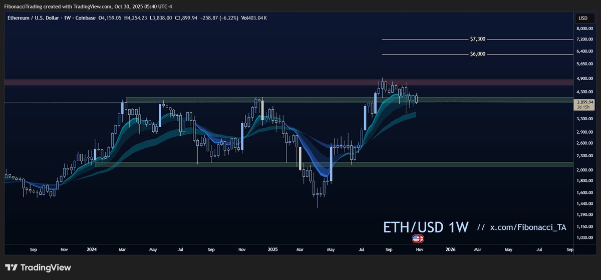 Fellow analyst FibonacciTrading said a “dip toward $3,300 would still count as a healthy pullback within the uptrend, held by the EMA cloud,” as shown in the weekly chart below.