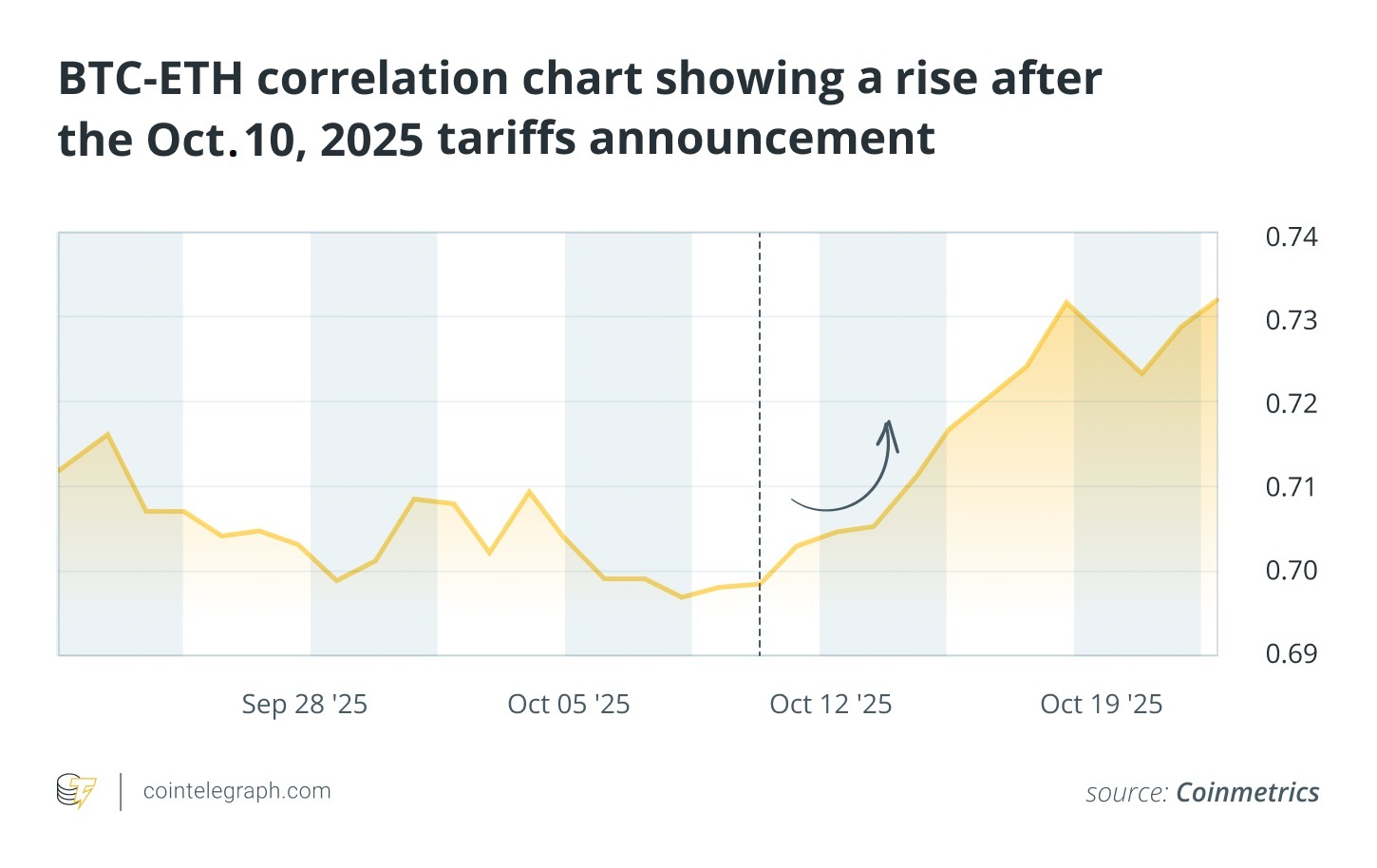 For example, following the Oct. 10, 2025, tariff announcement, the crypto market experienced a broad liquidation event, with Bitcoin falling sharply. According to CoinMetrics, the BTC-ETH correlation rose from 0.69 to 0.73, while the BTC-XRP correlation increased from 0.75 to 0.77 over the next eight days.