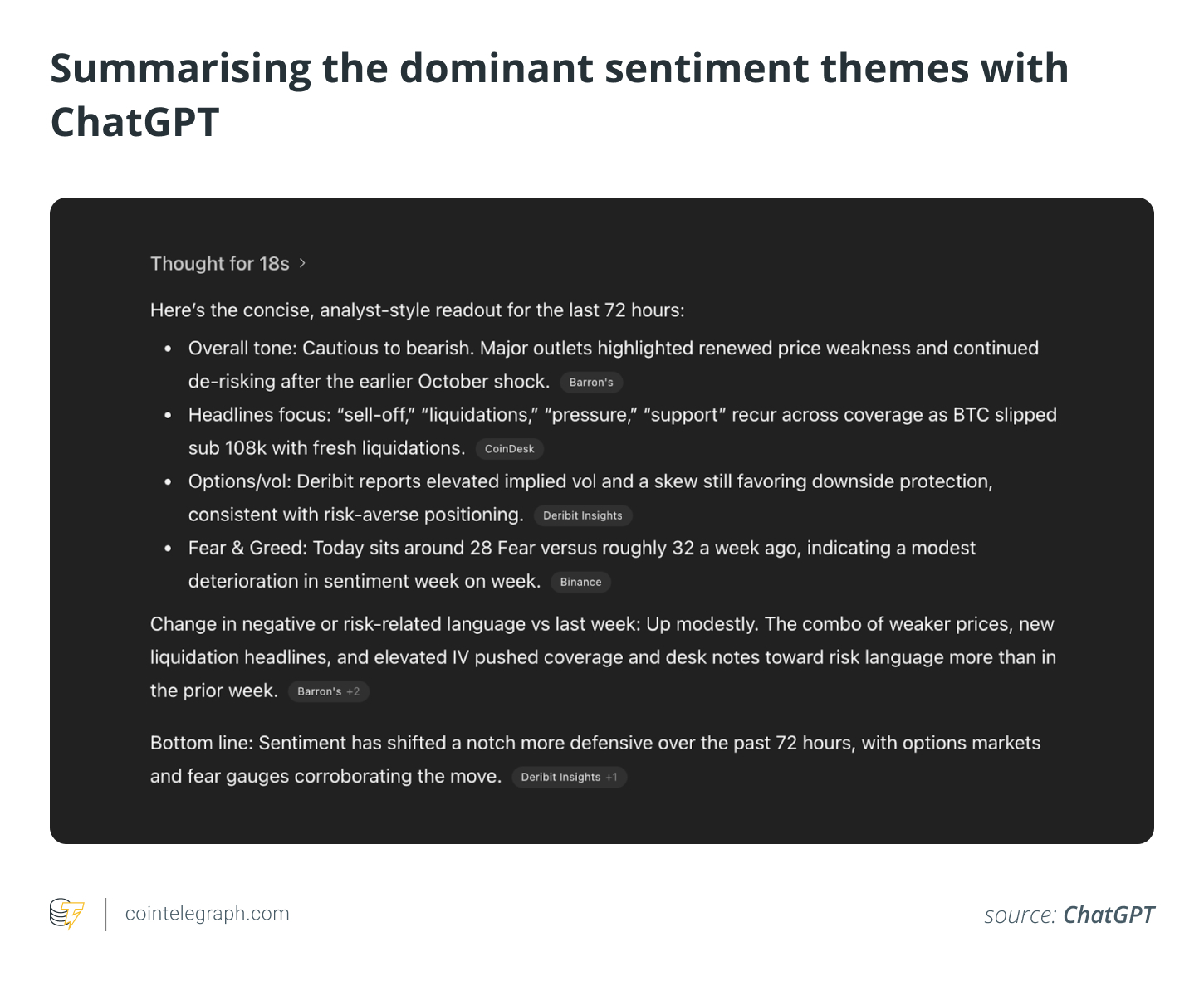 ChatGPT can process thousands of posts and headlines to identify shifts in market narrative. When optimism fades and anxiety-driven terms such as “liquidation,” “margin” or “sell-off” begin to dominate, the model can quantify that change in tone.