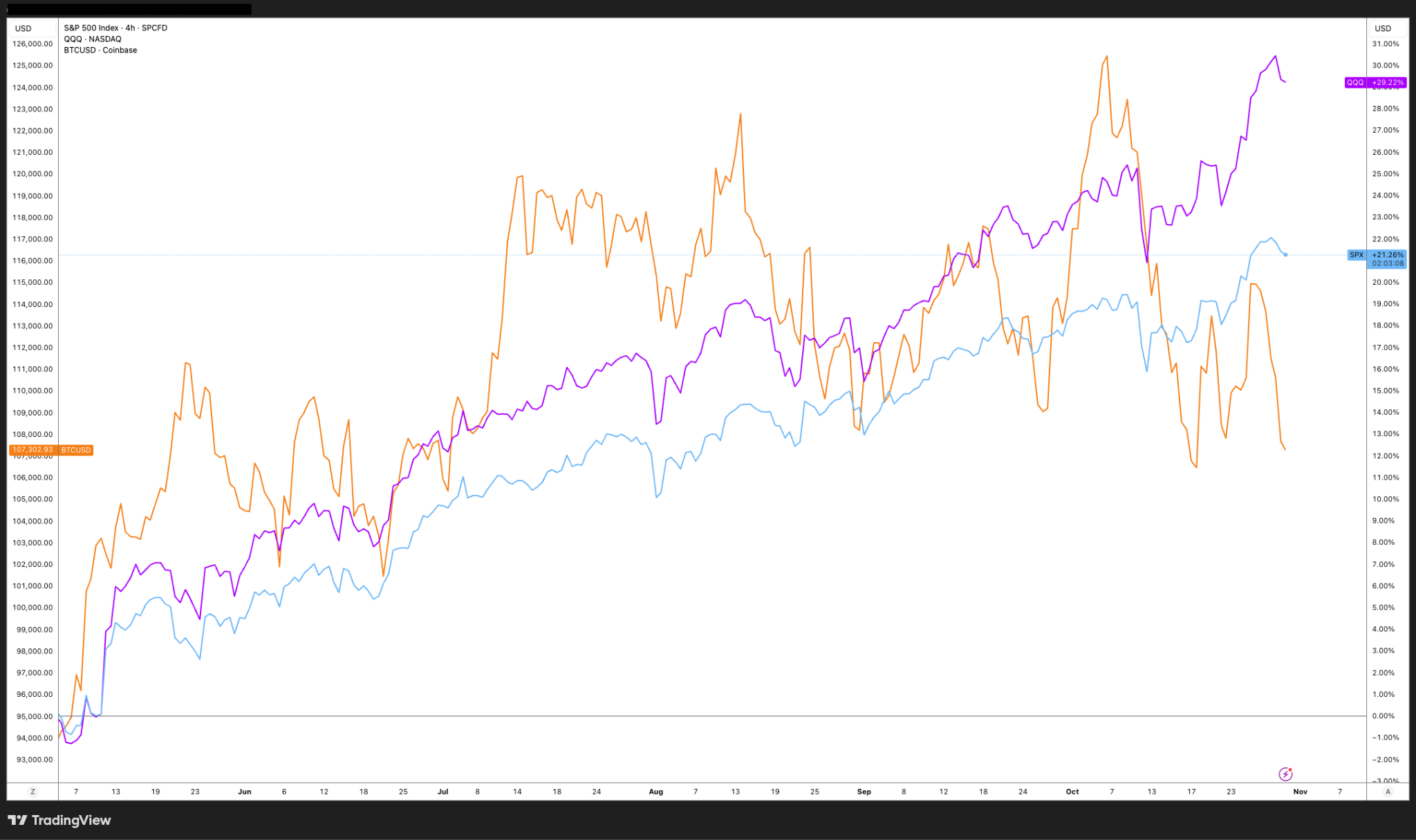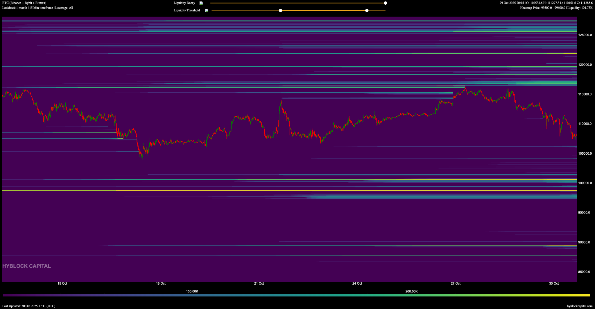 Bitcoin’s (BTC) end-of-month sell-off accelerated as the price dropped to $107,328 shortly after the NY open and was followed by an intraday low at $106,800. The move mirrors a slight weakness in US stock markets, where the S&P 500 and Nasdaq show slight losses despite third-quarter Big Tech earnings being forecast to surpass expectations.